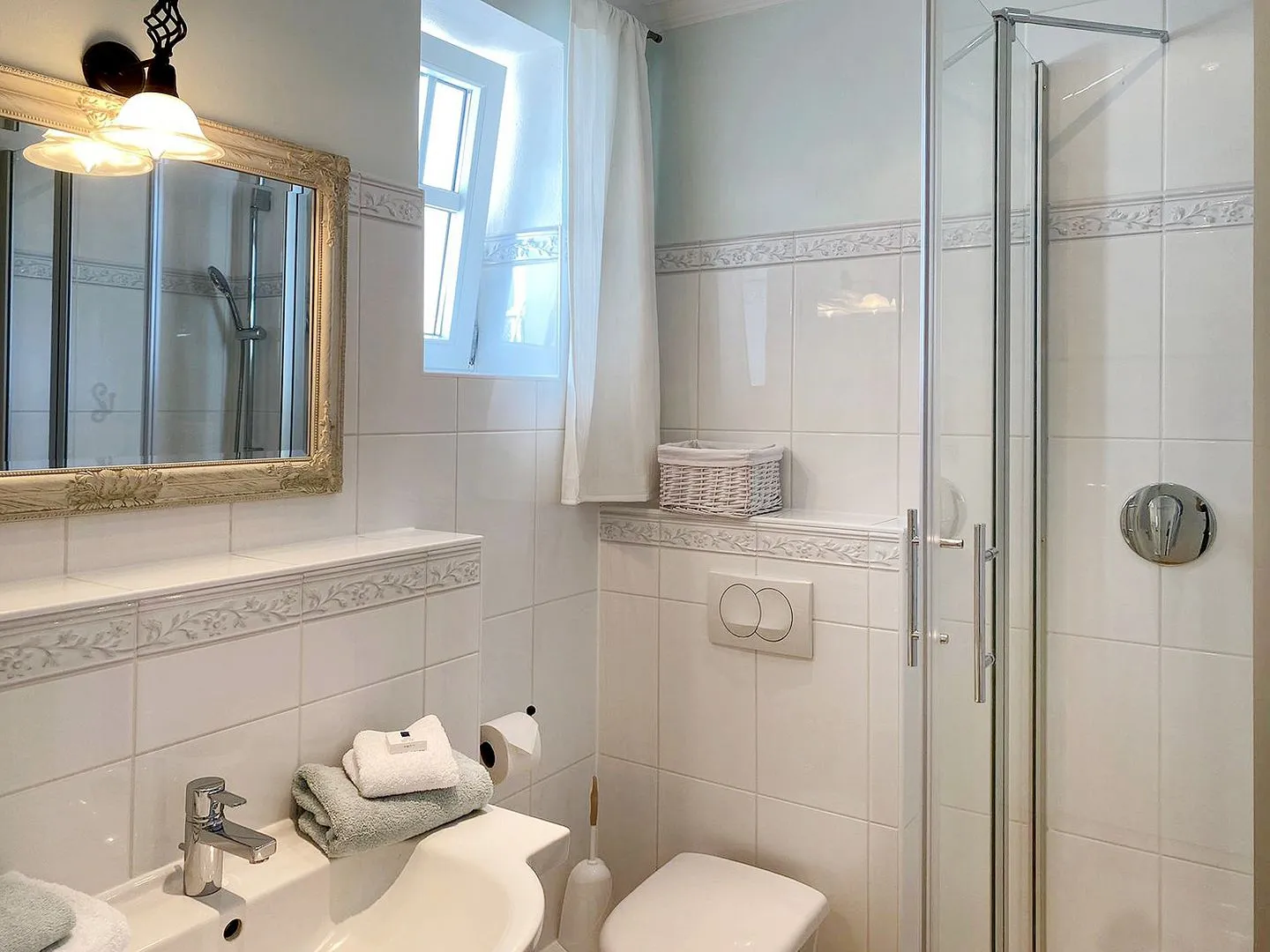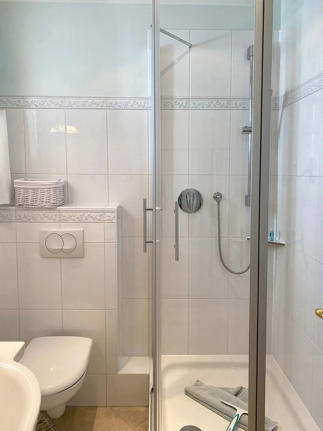 Das Duschbad mit WC ist kompakt und hell gestaltet.