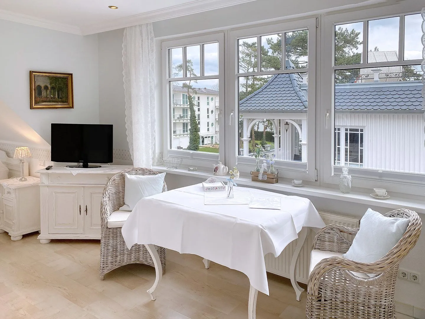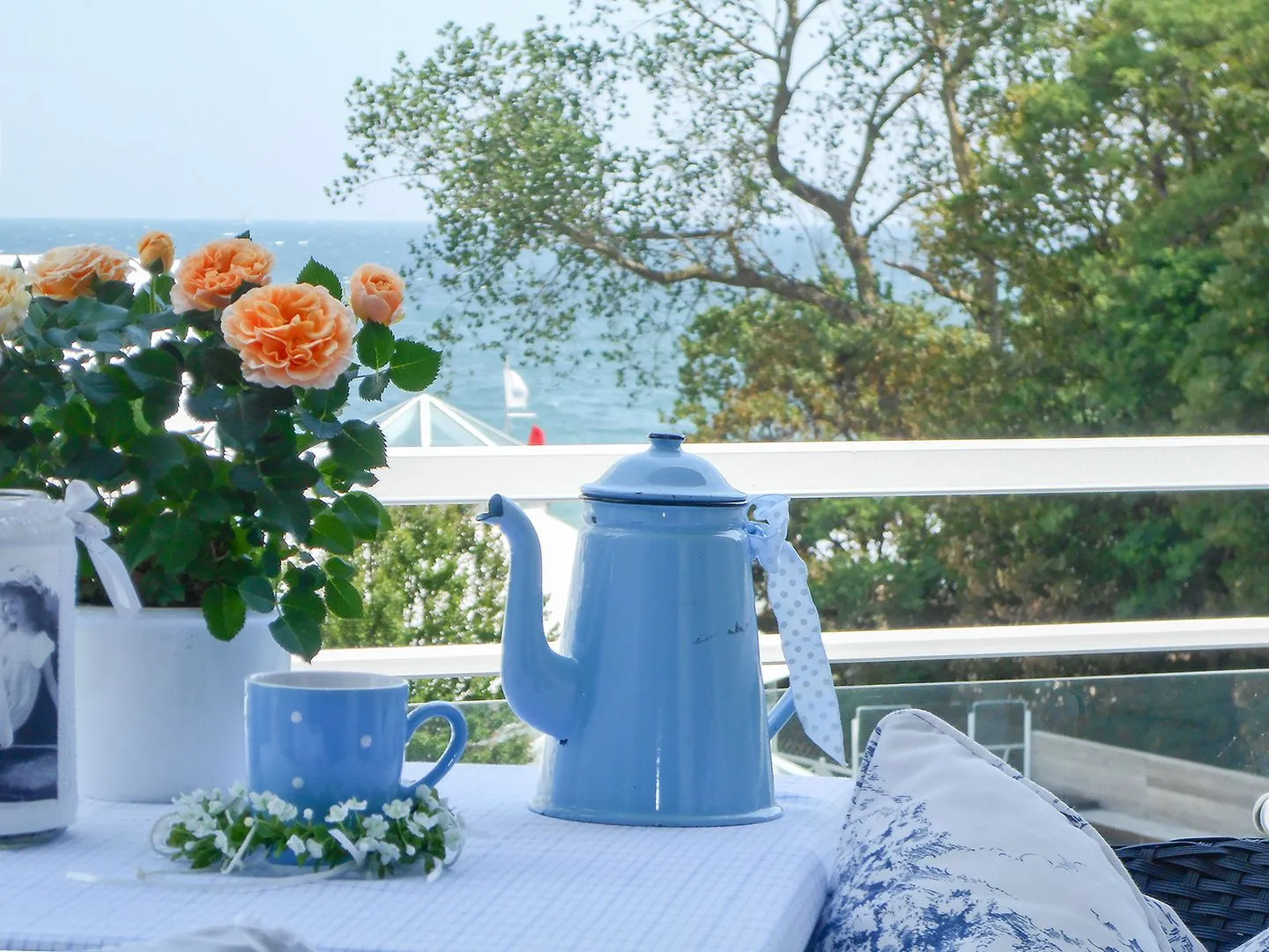 Der gemütliche Balkon zur Ostsee bietet einen Teilmeerblick und lädt schon am Morgen dazu ein, den Tag entspannt zu beginnen.