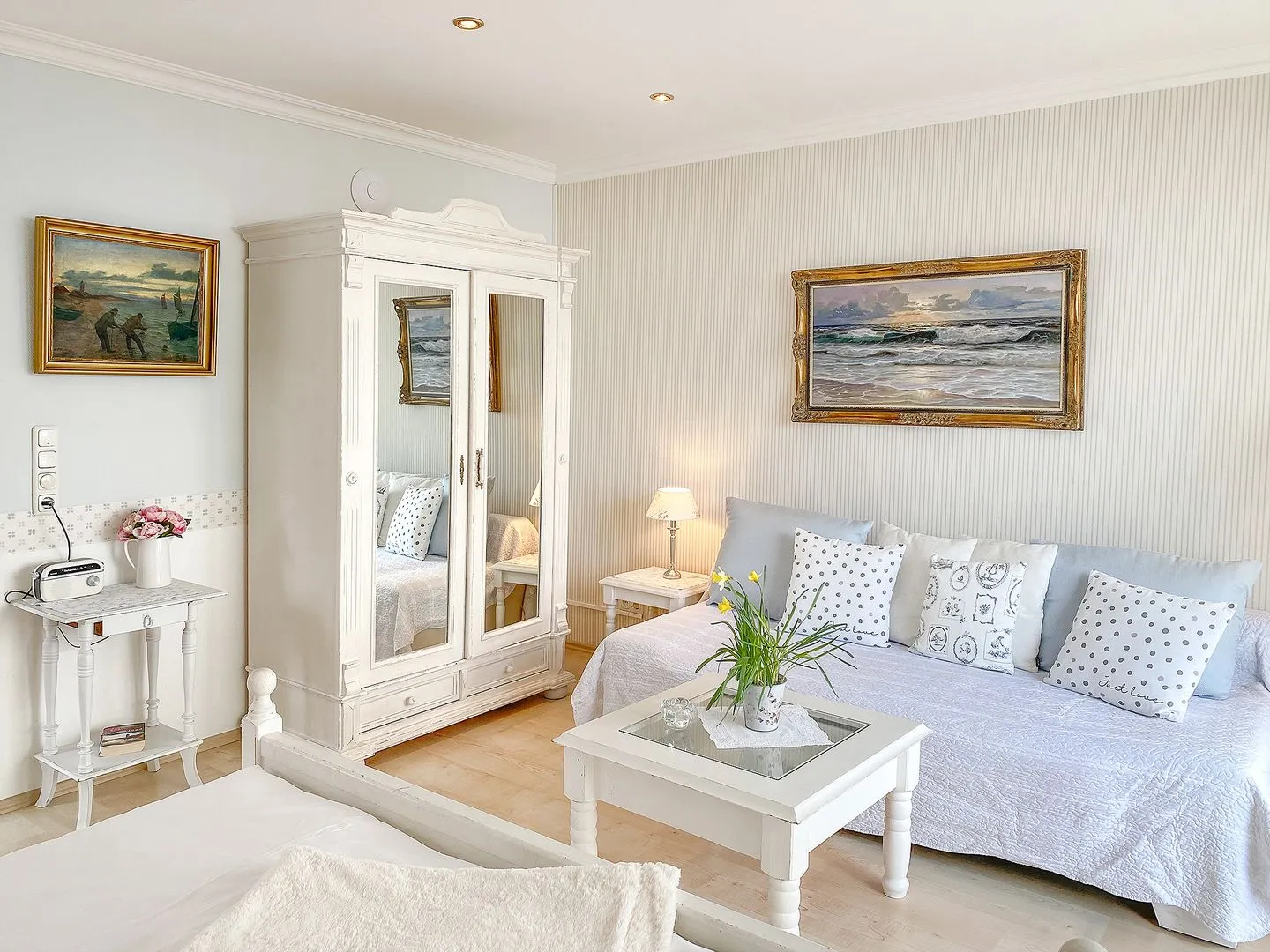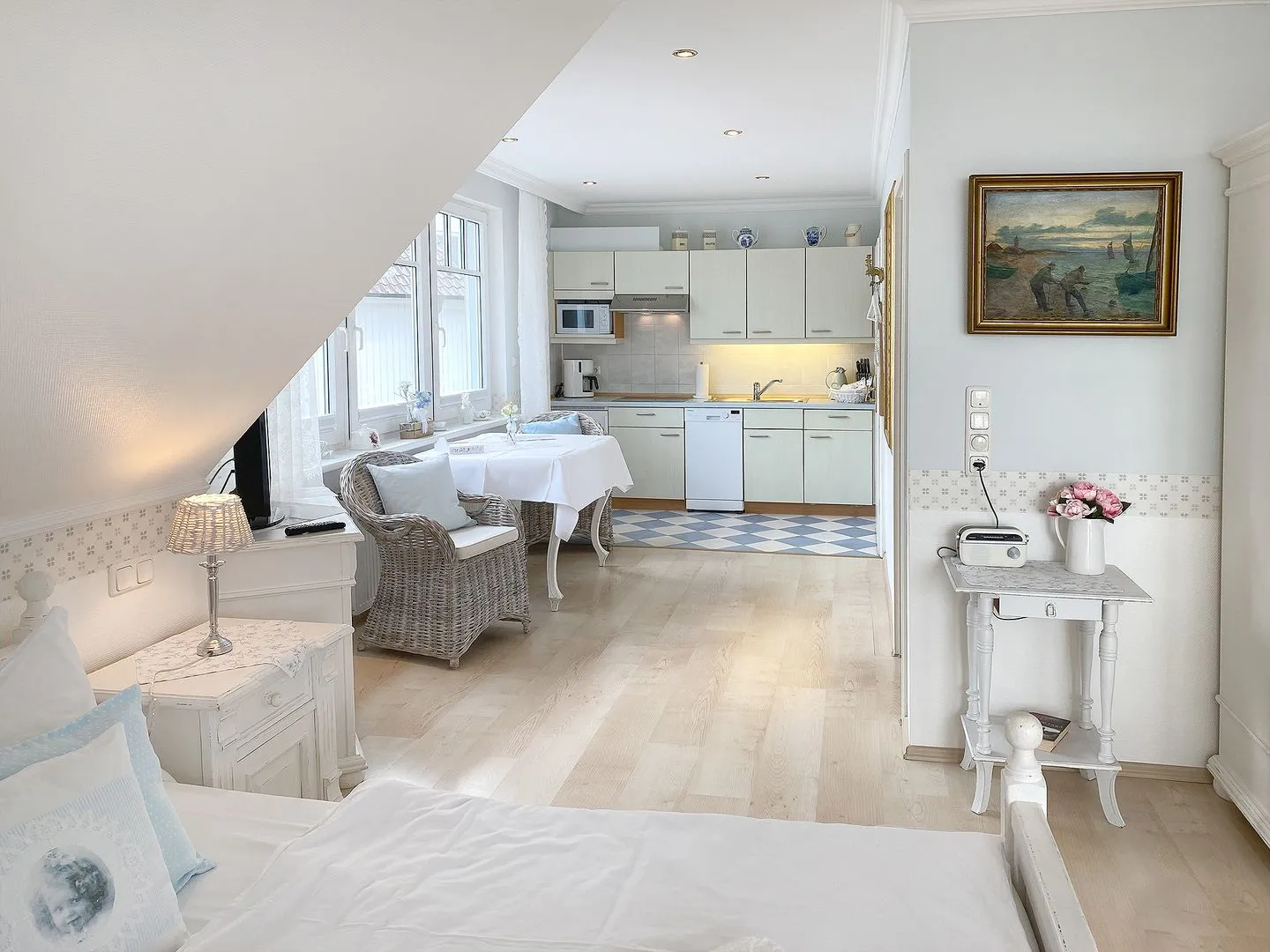 Das helle Wohn-/Schlafzimmer ist ausgestattet mit einem gemütlichen Sofa und Doppelbett sowie TV und WLAN - perfekt, um nach einem Strandtag zur Ruhe zu kommen.