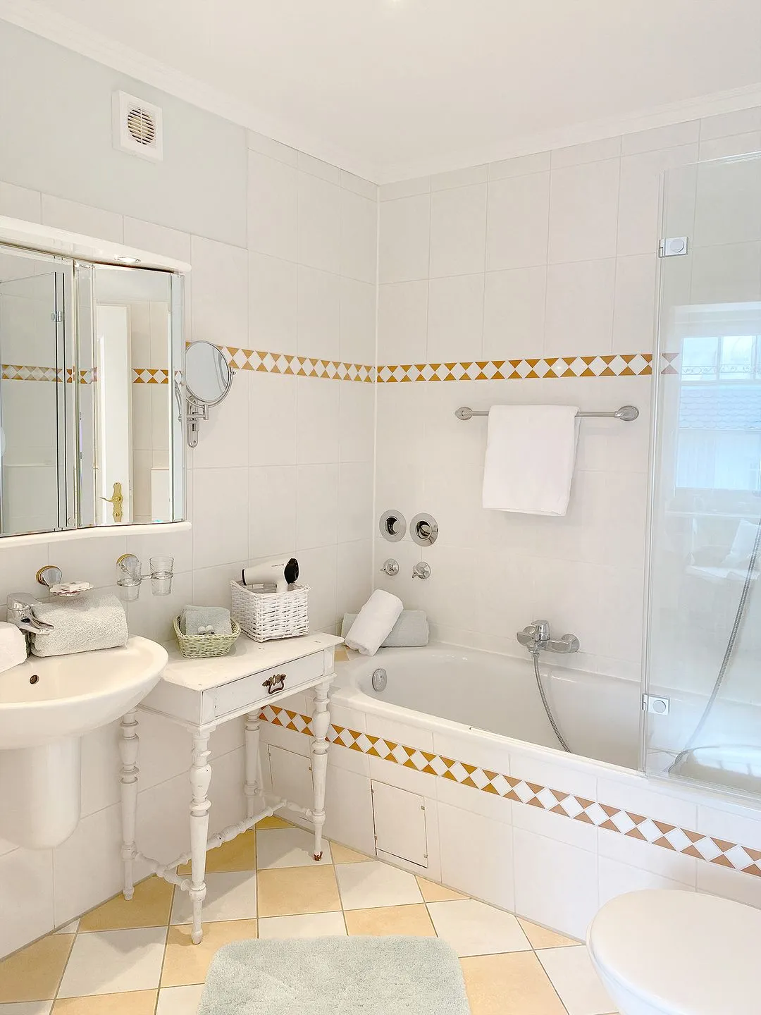 Das Badezimmer ist ausgestattet mit einer Badewanne mit Duschmöglichkeit, WC, Föhn und Kosmetikspiegel.