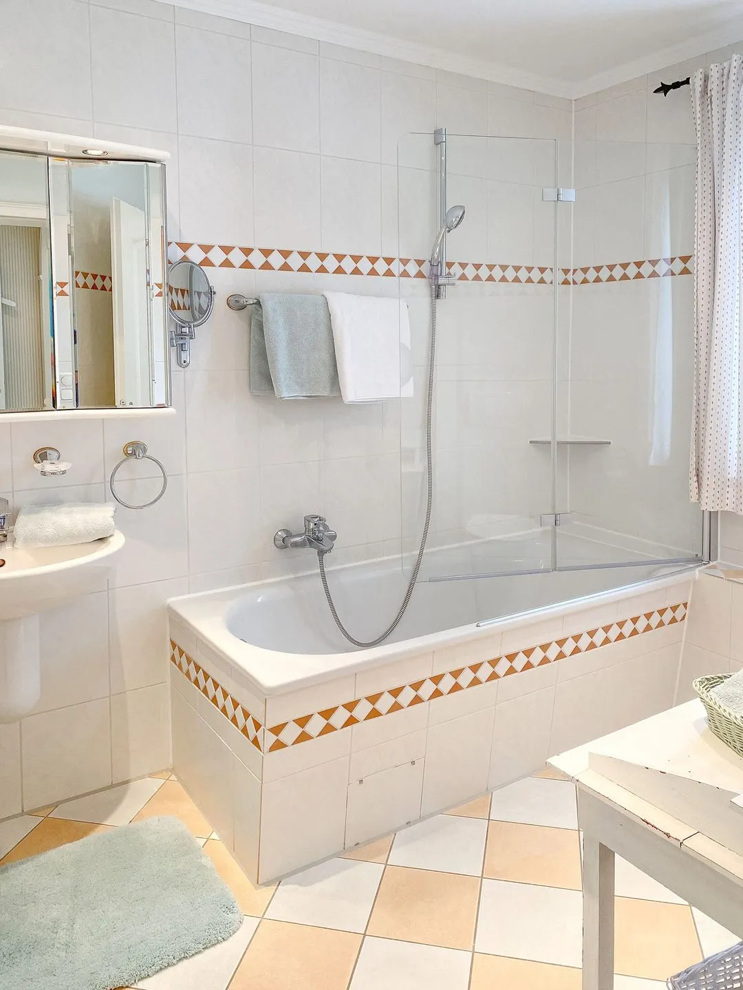 Das Badezimmer ist ausgestattet mit einer Badewanne mit Duschmöglichkeit, WC, Föhn und Kosmetikspiegel.