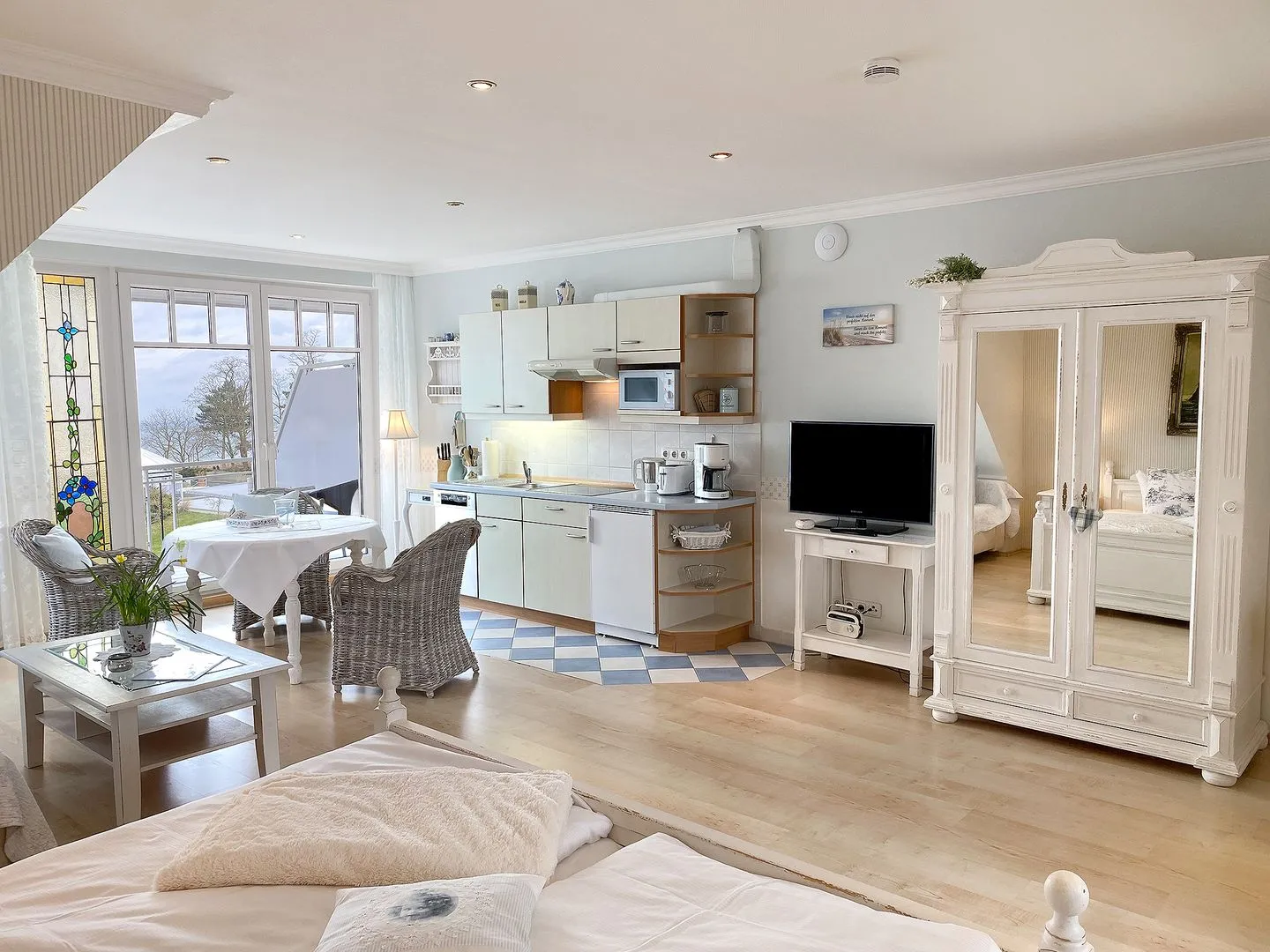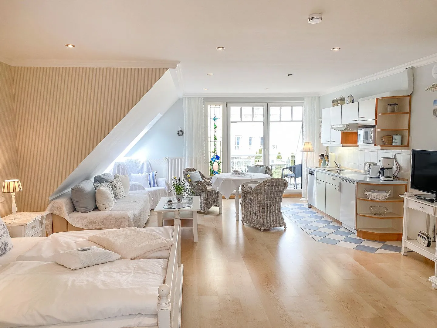 Das helle Wohn-/Schlafzimmer ist ausgestattet mit einem gemütlichen Schlafsofa (für 1 Person) und Doppelbett sowie TV und WLAN – perfekt, um nach einem Strandtag zur Ruhe zu kommen.