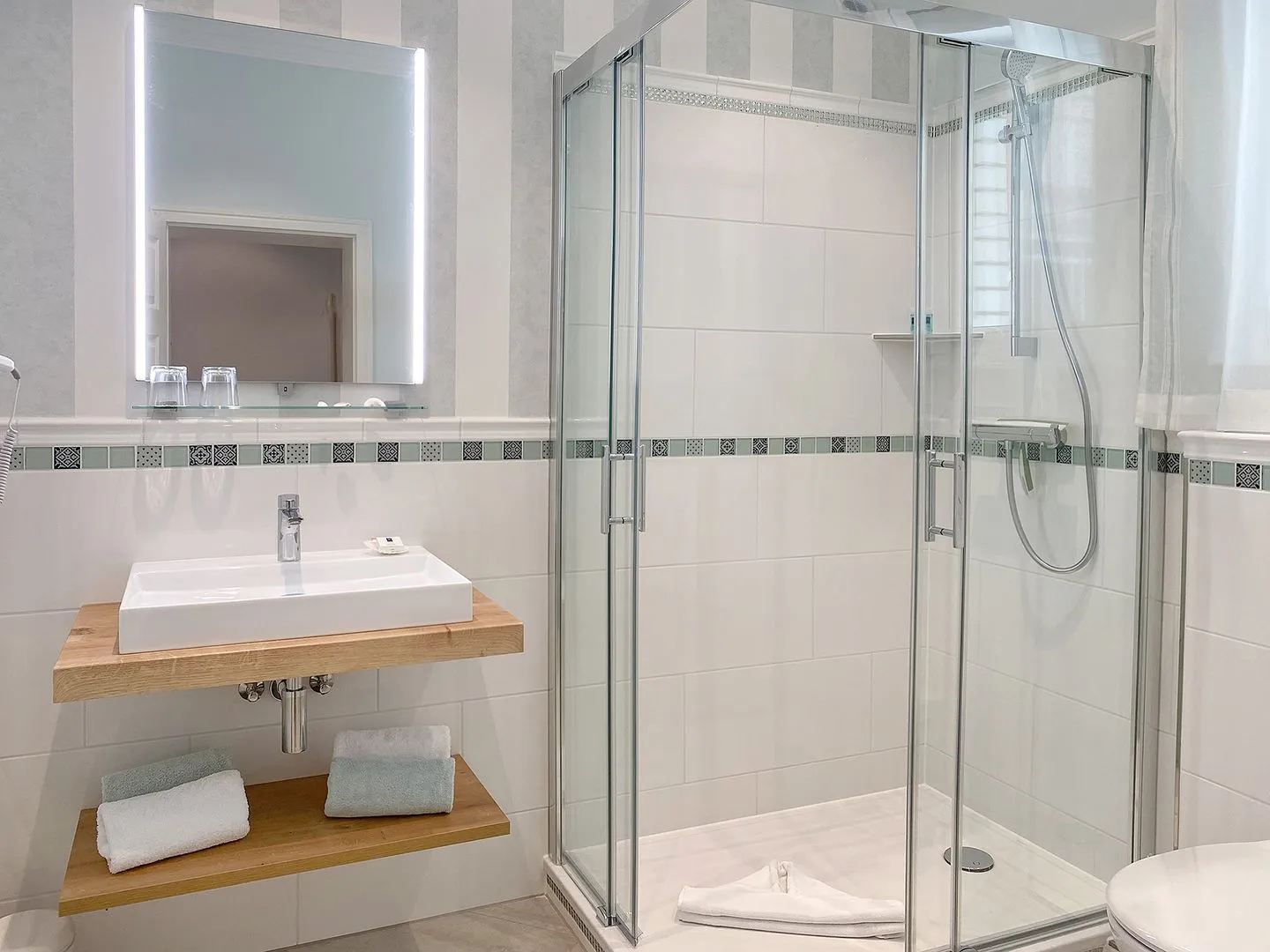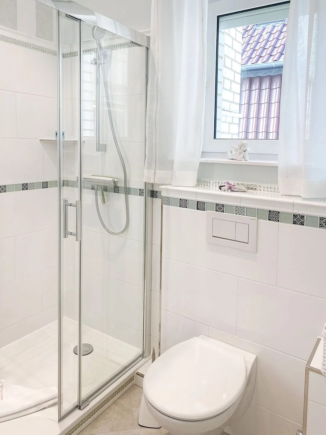 Dahinter liegt das neue, großzügige Badezimmer mit moderner Dusche, WC und Föhn.