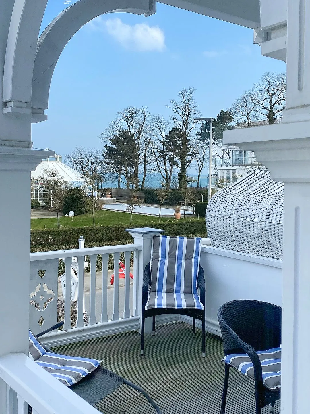 Der gemütliche Balkon zur Ostsee bietet einen kleinen Meerblick und lädt schon am Morgen dazu ein, den Tag entspannt zu beginnen.