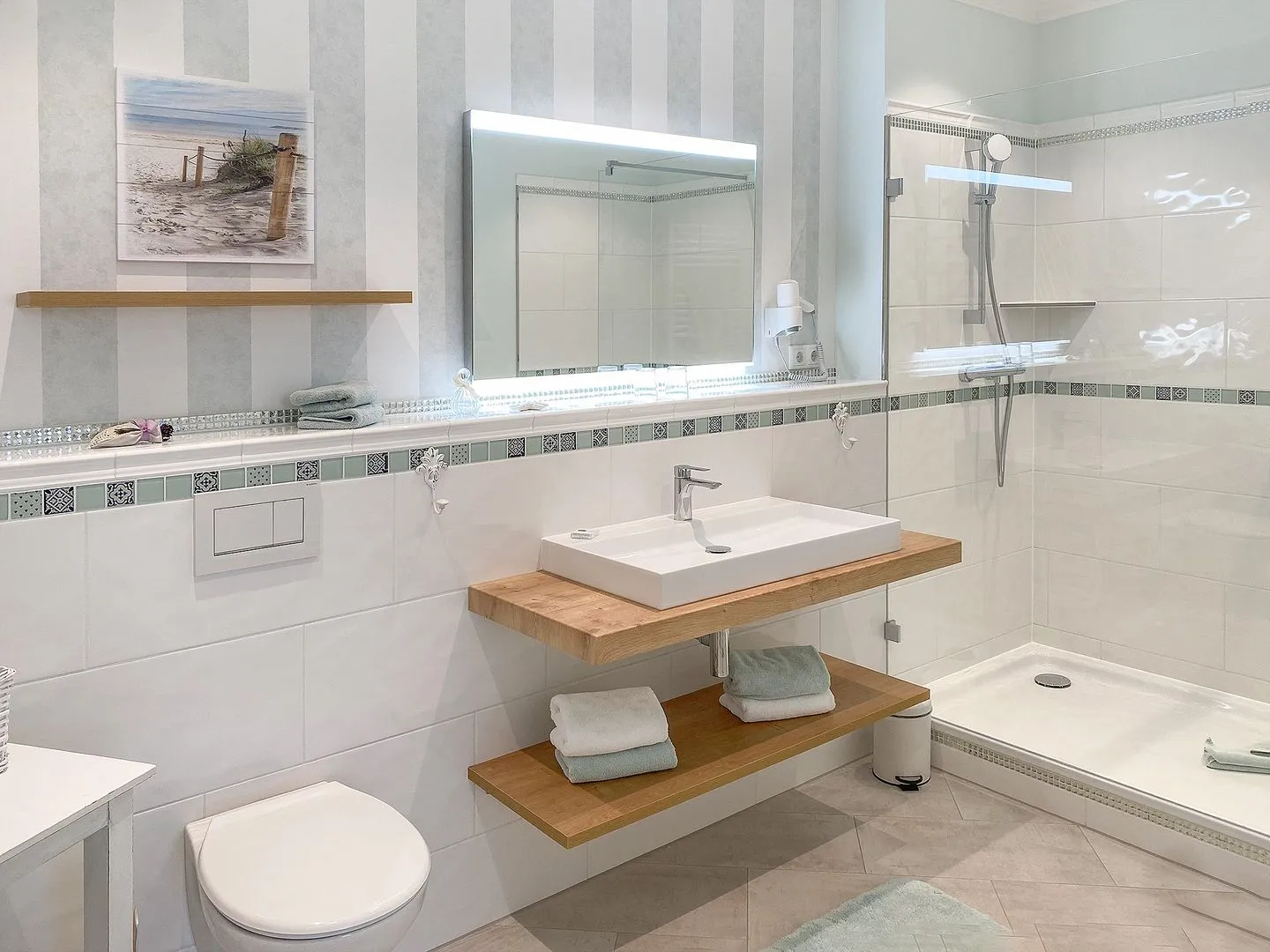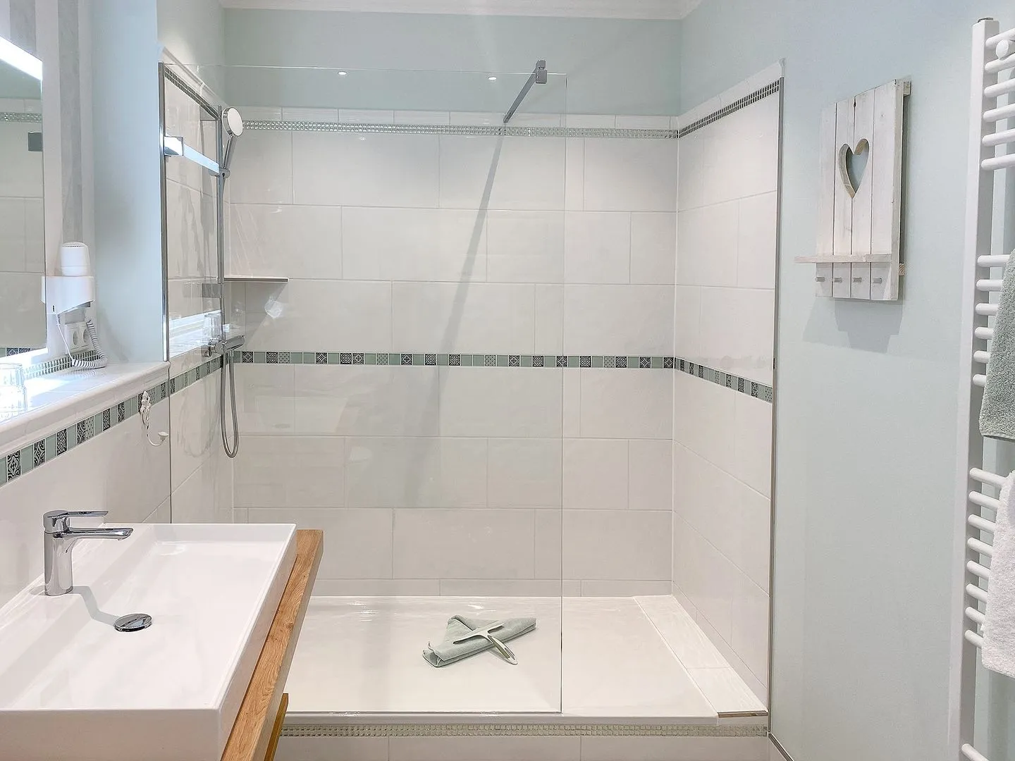 Dahinter liegt das neue, großzügige Badezimmer mit moderner Walk-in-Dusche, WC und Föhn.