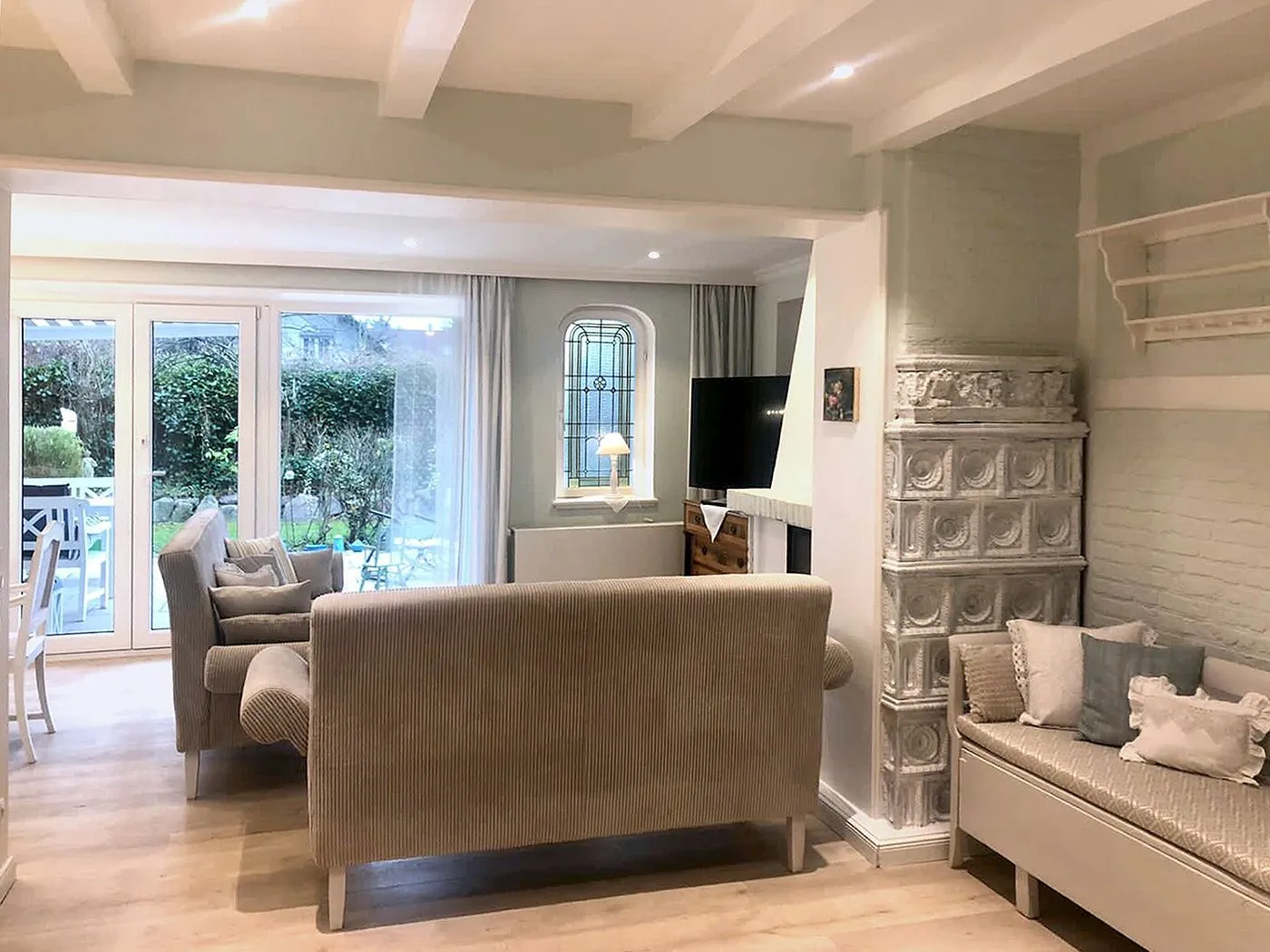 Ein gemütlicher Sitzbereich mit Kabel-TV sorgt für entspannte Stunden. Ein großer Esstisch mit Gartenblick bietet Platz für alle.
