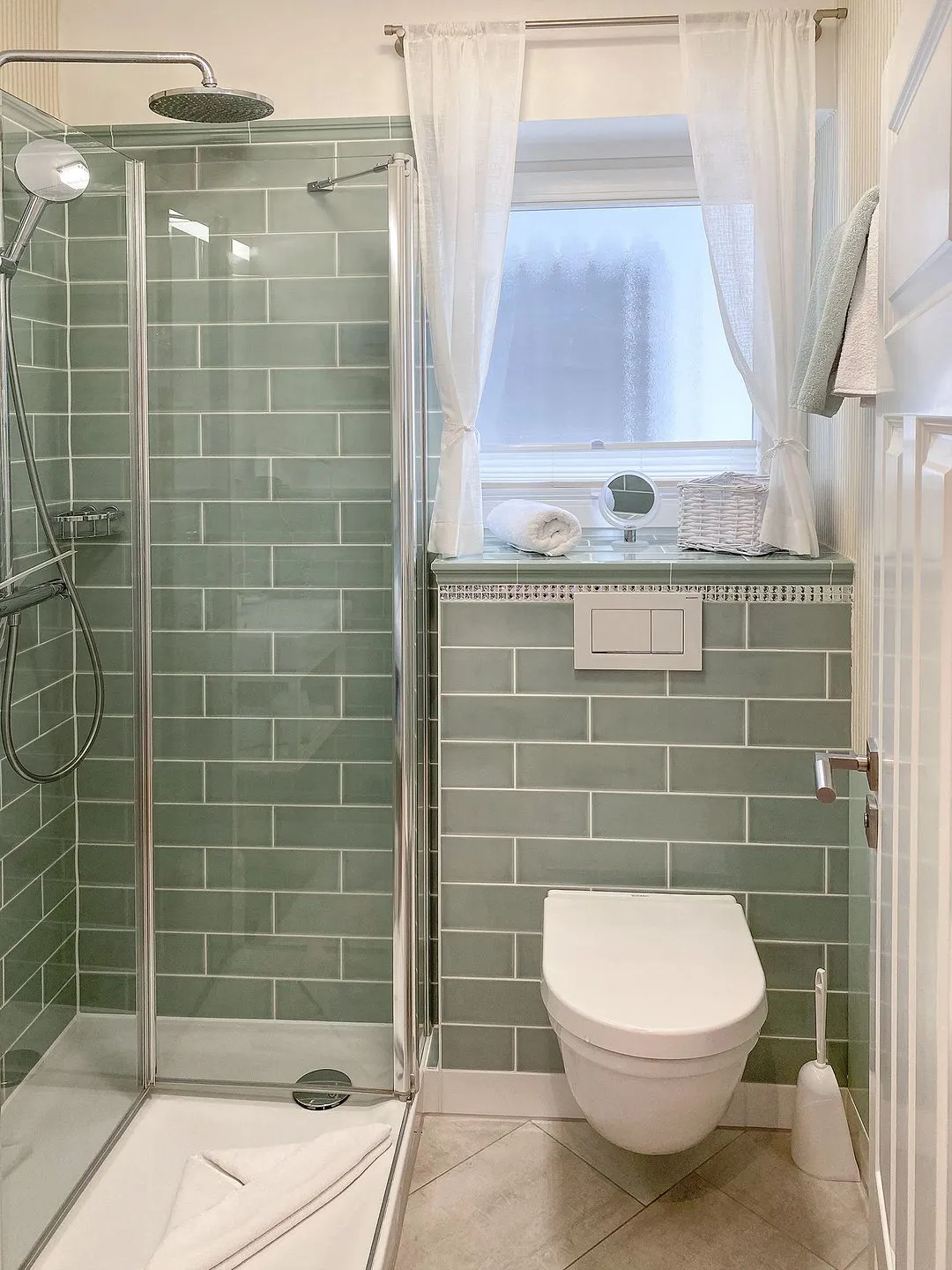 Das kompakte Duschbad/WC ist funktional ausgestattet mit Kosmetikspiegel sowie Föhn.