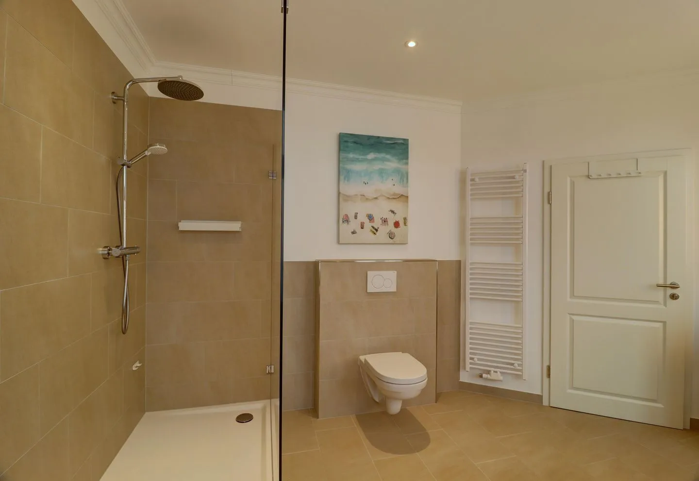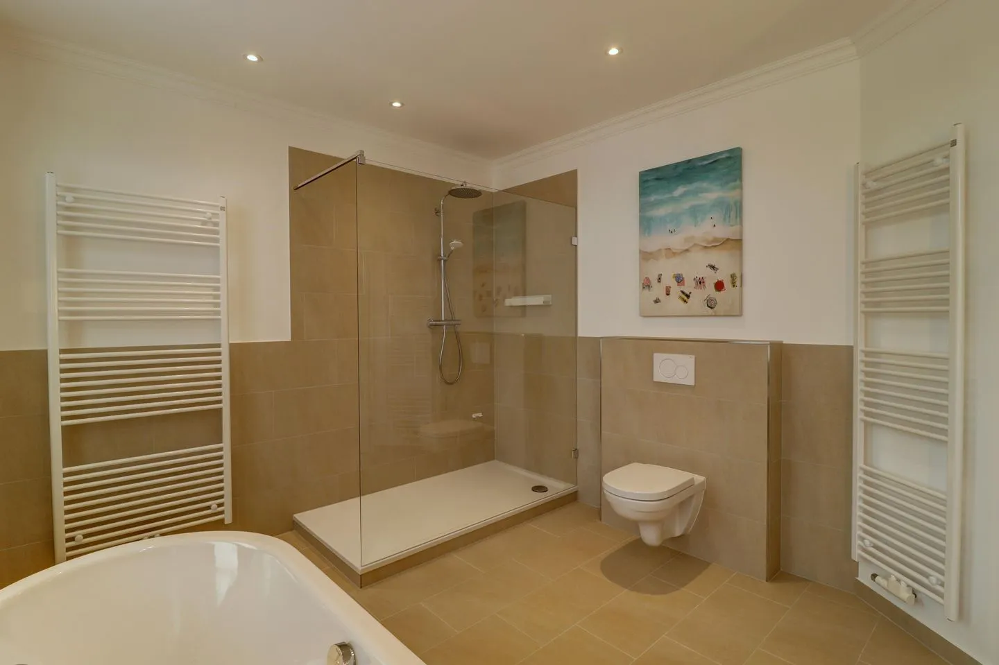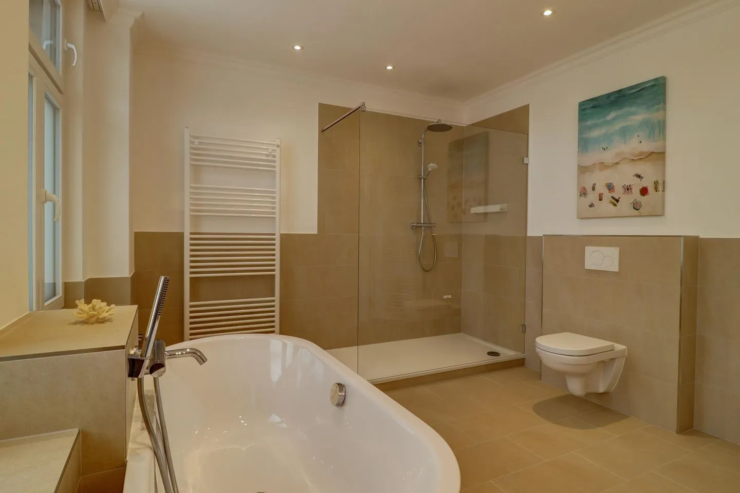 Das große, exklusive Badzimmer mit Walk-in Regendusche, einer freistehenden Badewanne, WC, Föhn und Kosmetikspiegel lässt keine Wünsche offen.
