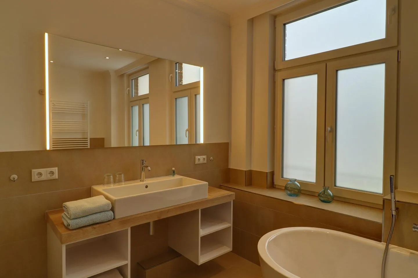 Sehr großes Badezimmer mit freistehender Badewanne & großzügiger Walk-in Dusche